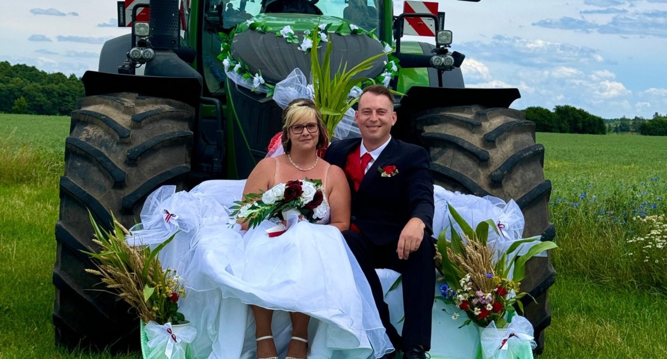 Unser langjähriger Mitarbeiter Oliver und seine Frau Jessica haben sich das Jawort gegeben. Seine Kollegen überraschten ihn mit „seinem“ feierlich geschmückten Fendt vor dem Standesamt und fuhren das Brautpaar zur Hochzeitsfeier nach Wittstock.